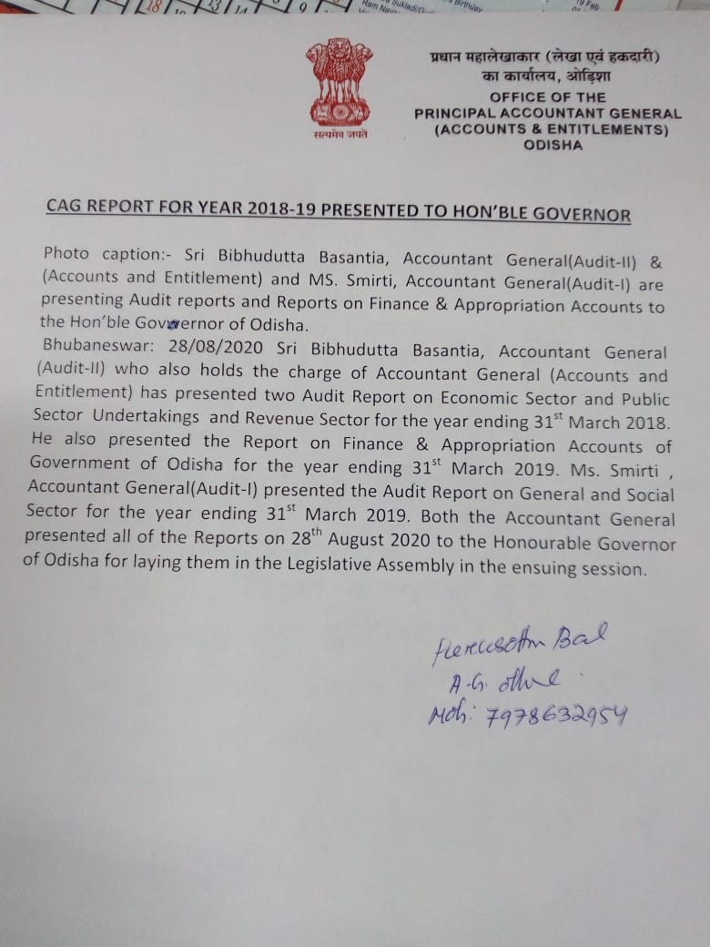 ଆଗାମୀ ବିଧାନ ସଭାରେ ଉପସ୍ଥାପିତ ହେବାକୁ ଥିବା CAG ରିପୋର୍ଟ ଓ ରାଜ୍ୟର ଆର୍ଥିକ ସ୍ଥିିତିର ଲେଖା ପରୀକ୍ଷା ଓ ବିବରଣୀ ରାଜ୍ୟପାଳ ପ୍ରଫେସର ଶ୍ରୀ ଗଣେଷୀ ଲାଲଙ୍କୁ ପ୍ରଦାନ କରିଛନ୍ତି ରାଜ୍ୟ ମହାଲେଖାକାର ବିଭୂଦତ୍ତ ବସ୍ତିଆ । ଅଡିଟ୍ ୨ ଓ ମହାଲେଖାକାର ୨୦୧୭ – ୧୮ ଆର୍ଥିକ ବର୍ଷର ଆର୍ଥିକ କ୍ଷେତ୍ର ଓ ସରକାରୀ ଉଦ୍ୟୋଗ କ୍ଷେତ୍ରରେ ସିଏଜି ରିପୋର୍ଟ ସହ ୨୦୧୮-୧୯ ବର୍ଷର ରାଜ୍ୟର ଆର୍ଥିକ ସ୍ଥିତି ବୀବରଣି ପ୍ରଦାନ କରାଯାଇଥିବା ବେଳେ ମହାଲେଖାକାର ସୁଶ୍ରୀ ସ୍ମ୍ରିତି ୧୭-୧୮ ବର୍ଷର ସାଧାରଣ ଓ ସାମାଜିକ କ୍ଷେତ୍ରର ପରୀକ୍ଷା ଲେଖା ସିଏଜି ରିପୋର୍ଟ ସହ ରାଜ୍ୟର ଆର୍ଥିକ ସ୍ଥିତି ରିପୋର୍ଟ ପ୍ରଦାନ କରିଛନ୍ତି ।