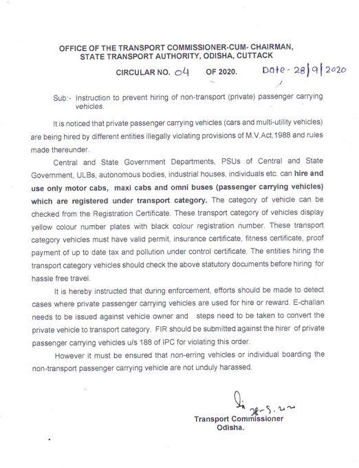 ସରକାରୀ ଓ ଘରୋଇ ସଂସ୍ଥାକୁ ପରିବହନ କମିସନରଙ୍କ କଡ଼ା ନିର୍ଦେଶ
