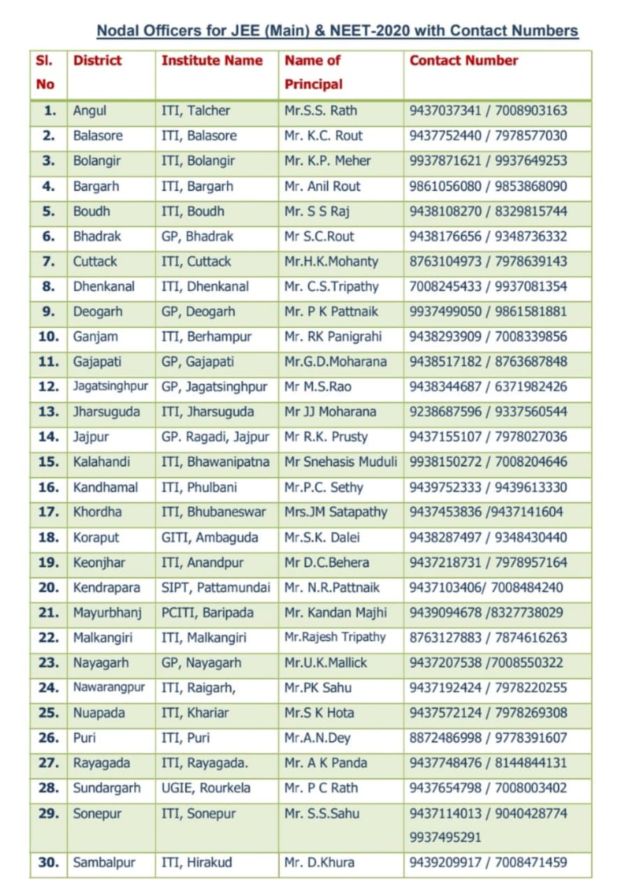 ଭୁବନେଶ୍ୱର , ୨୮।୦୮: ରାଜ୍ୟର ବିଭିନ୍ନ ଜିଲ୍ଲାରେ କରୋନା ଓ ବନ୍ୟା ସ୍ଥିତି ସଙ୍ଗୀନ ରହିଛି । ଏହା ମଧ୍ୟରେ ଆୟୋଜିତ ହେବାକୁ ଯାଉଛି NEET ଓ JEE ପରୀକ୍ଷା । ତେବେ ଏହି ସମୟରେ ଯେପରି ପରୀକ୍ଷାର୍ଥୀମାନେ କୌଣସି ସମସ୍ୟାର ସମ୍ମୁଖୀନ ନହୁଅନ୍ତି ସେନେଇ ରାଜ୍ୟ ସରକାର ବିଭିନ୍ନ ବ୍ୟବସ୍ଥା ଗ୍ରହଣ କରିଛନ୍ତି । ଏପରିକି ପରୀକ୍ଷାର୍ଥୀଙ୍କ ପାଇଁ ସମସ୍ତ ଜିଲ୍ଲାରେ ବିଭିନ୍ନ ନୋଡାଲ ସେଣ୍ଟର କରାଯିବା ସହ ଅଫିସରଙ୍କ ମୋବାଇଲ ନମ୍ବର ମଧ୍ୟ ଜାରି କରାଯାଇଛି ।