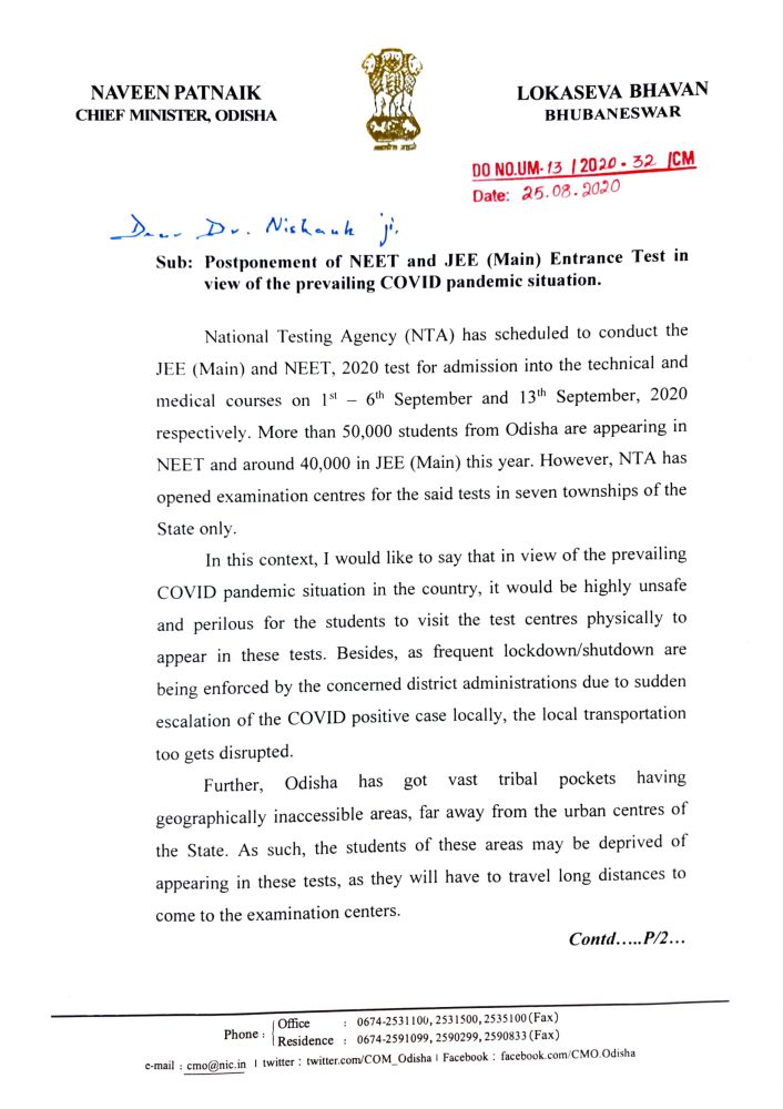 ନିଟ୍-ଜେଇଇ ପରୀକ୍ଷା ଘୁଞ୍ଚାଇବାକୁ କେନ୍ଦ୍ର ଶିକ୍ଷା ମନ୍ତ୍ରୀଙ୍କୁ ମୁଖ୍ୟମନ୍ତ୍ରୀଙ୍କ ଚିଠି