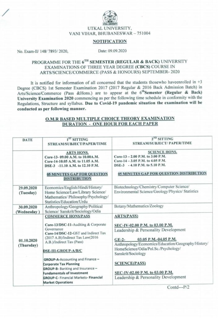 ଉତ୍କଳ ବିଶ୍ୱବିଦ୍ୟାଳୟ ଅଧିନସ୍ଥ ସମସ୍ତ ମହାବିଦ୍ୟାଳୟ ଗୁଡିକରେ ଯୁକ୍ତ ତିନି ଶେଷ ସେମିଷ୍ଟାର ପରୀକ୍ଷା ତାରିଖ ନେଇ ଆଜି ବିଜ୍ଞପ୍ତି ପ୍ରକାଶ ପାଇଛି । ସେପ୍ଟେମ୍ବର 29 ରୁ ଅକ୍ଟୋବର 3 ମଧ୍ୟରେ ଥିଓରୀ ପରୀକ୍ଷା ହେବ। ଦୁଇଟି ସିଟିଂରେ ହେବ ପରୀକ୍ଷା । ସେହିପରି ସେପ୍ଟେମ୍ବର 22 ରୁ 26 ତାରିଖ ମଧ୍ୟରେ ଅନୁଷ୍ଠିତ ହେବ ପ୍ରାକ୍ଟିକାଲ ପରୀକ୍ଷା । ଓବଜେକ୍ଟିଭ୍ ପ୍ରଶ୍ନ ଦ୍ଵାରା ଓଏମଆର ସିଟରେ ଥିଓରୀ ପରୀକ୍ଷା ହେବ ।